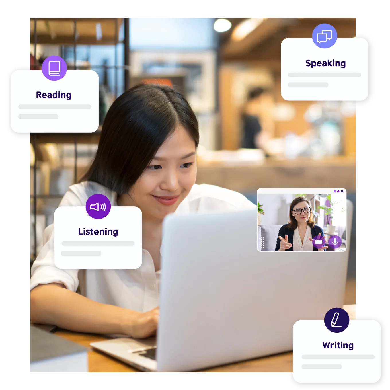 전문 튜터에게 받는 25분 1:1 개인 수업 - 심도 있게 구성된 학습 주제를 선택하거나 혹은 자유 주제를 선택해 개인수업을 받을 수 있습니다. 보다 강도 높은 인텐시브 코스 혹은 개인 맞춤 수업을 원할 경우 여러분이 선호하는 튜터의 수업에 참석해 원하는 진도로 수업을 수강할 수 있습니다.